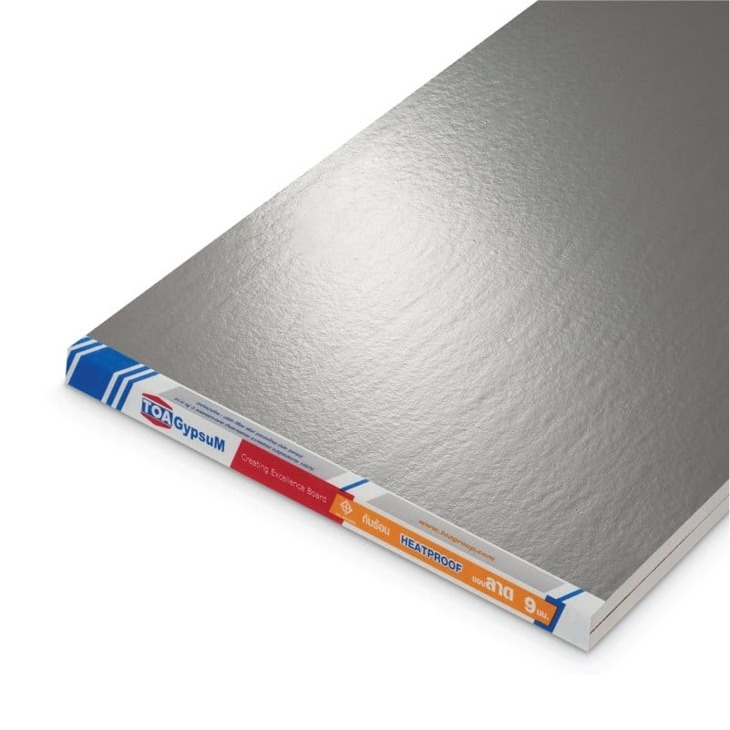 - แผ่นยิปซัมเคลือบด้วยแผ่นอลูมิเนียมฟรอยด์สามารถสะท้อนรังสีความร้อนได้ถึง 90%