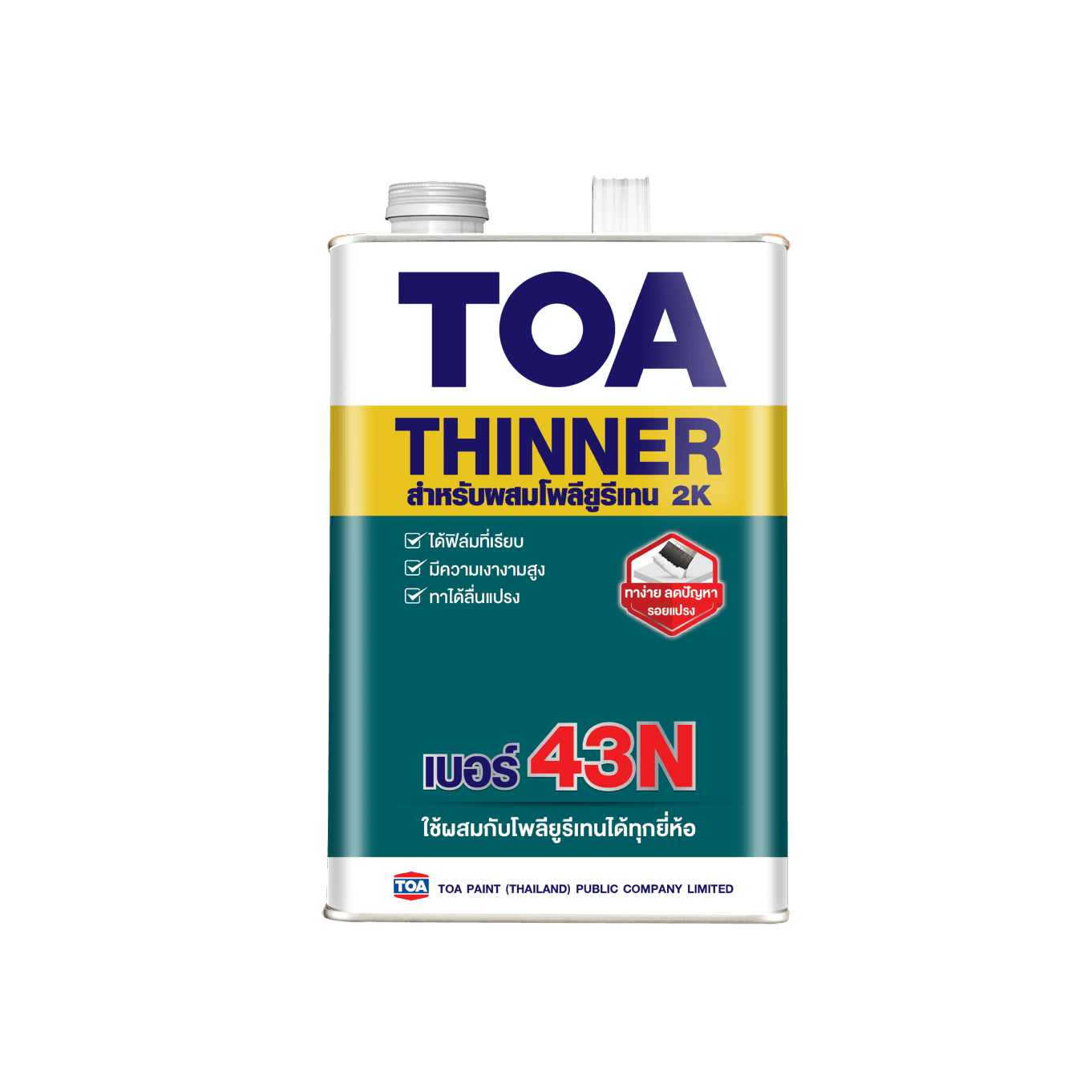 ทีโอเอ โพลียูรีเทน ทินเนอร์ เบอร์ 43N ผลิตจากตัวทำละลายอินทรีย์แบบผสมชนิดพิเศษ เหมาะสำหรับ ผสมทีโอเอ โพลียูรีเทน 2 ส่วน ช่วยให้ทาง่าย ฟิล์มสีมีการยึดเกาะที่ดี