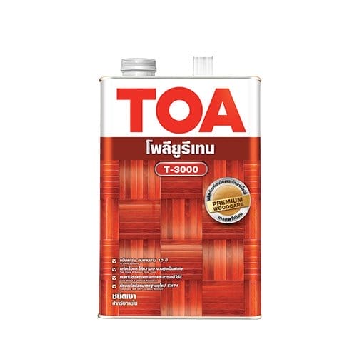 ทีโอเอ โพลียูรีเทน 1 ส่วน ชนิดเงา สำหรับภายใน T-3000 เป็นโพลียูรีเทนชนิดที่แห้งแข็งโดยทำปฏิกิริยากับความชื้นในอากาศ เหมาะสำหรับพื้นไม้ภายในที่ไม่มีแดดส่องถึง ทาง่าย ให้ความเงางามสูง ทนทานต่อการขูดขีด ทนทานต่อการขัดถู และทนต่อการกระแทกได้ดี ทนต่อกรด-ด่าง และสารเคมี ได้ดีเยี่ยม
