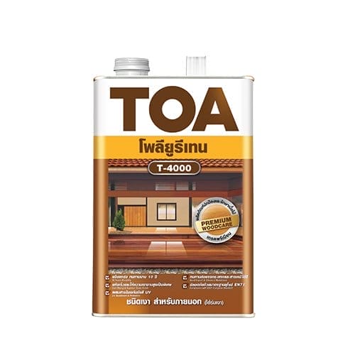 ทีโอเอ โพลียูรีเทน 1 ส่วน ชนิดเงา สำหรับภายนอก T-4000 เป็นโพลียูรีเทนชนิดที่แห้งแข็งโดยทำปฏิกิริยากับความชื้นในอากาศ เหมาะสำหรับพื้นไม้ภายในที่มีแดดส่องถึงเป็นบางเวลา ทาง่าย ให้ความเงางามสูง ทนทานต่อการขูดขีด ทนทานต่อการขัดถู และ ทนต่อการกระแทกได้ดี ทนต่อกรด-ด่าง และสารเคมี ได้ดีเยี่ยม