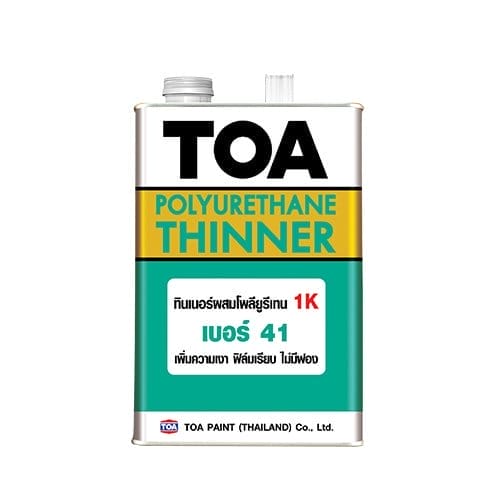 ทีโอเอ ทินเนอร์ เบอร์ 41 ผลิตจากตัวทำละลายอินทรีย์แบบผสมชนิดพิเศษ เหมาะสำหรับผสม โพลียูรีเทน 1 ส่วน ช่วยให้ทาง่าย ให้ฟิล์มสีที่เรียบ มีการยึดเกาะที่ดี และมีความเงาสูง