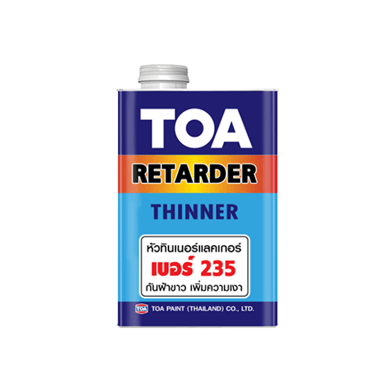 หัวทินเนอร์ ทีโอเอ เบอร์ T235 เป็นตัวทำละลายอินทรีย์ชนิดแห้งช้า ช่วยให้ฟิล์มสีเรียบและเงา ป้องกันการเกิดฝ้าขาว ใช้สำหรับผสมแล็กเกอร์, โพลียูรีเทน หรือสีพ่นแห้งเร็ว ช่วยให้สามารถใช้งานสีได้ในสภาวะที่อากาศมีความชื้น หรือ ฝนตก
